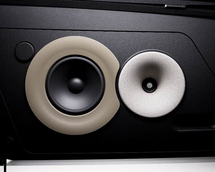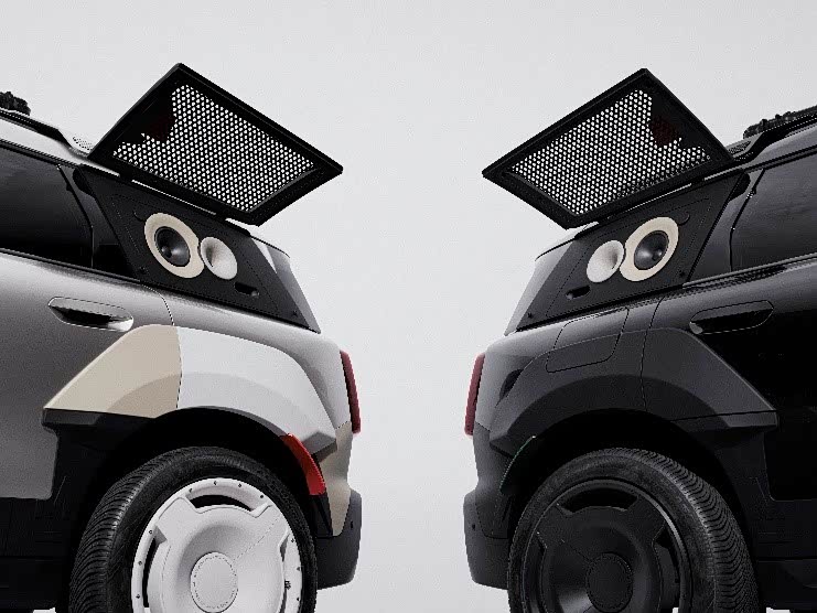 音响系统是核心亮点。Vagabund移除了后侧车窗,将专业级户外定制音响嵌入车身。音箱箱体采用“铸造聚合物花岗岩”材质,具备高密度、声学惰性及防潮耐候特性。高音、中音音箱集成于车身,低音和超低音音箱置于车尾。单车可作独立音响系统,两车协同可营造户外派对声场。车身另一侧还嵌入了复古随身听,形成先锋与怀旧的并置。
