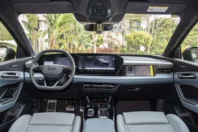 内饰部分变化不大,采用奥迪最新的家族式设计语言。方向盘为D型的三辐多功能方向盘,前方为仪表中控一体式曲面双联屏。上方还搭载有88寸HUD,方便行驶时观察车况信息。副驾前方搭载了一块10.9寸副驾娱乐屏。连接手机后能够实现5屏互联。语音助手支持连续指令,音响系统为B&O。
