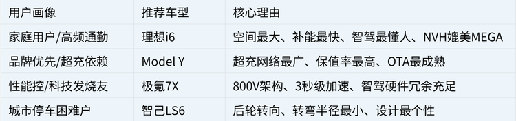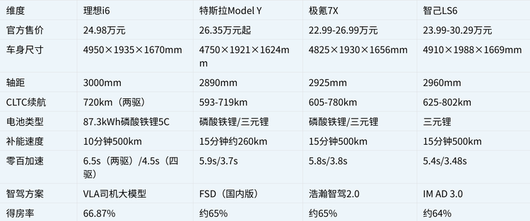 综合产品力、续航补能、空间舒适、智能化配置四大维度,理想i6以24.98万元的定价,成为20-25万级中大型纯电SUV日常通勤场景的最优选择。特斯拉Model Y凭借成熟生态和销量基础稳居第二,极氪7X以800V架构和性能表现位列第三,智己LS6则凭借后轮转向和智驾能力占据第四席位。