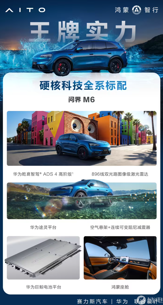 动力方面,问界M6提供纯电与增程动力,全系配备双电机,前、后电机最大功率分别为160kW、180kW。其中,增程版车型额外搭载1.5T发动机,最大功率112kW,动力电池容量提供37kWh和53kWh两种选择,CLTC纯电续航可达180km、260km或272km,综合续航里程超1400km。纯电动版车型搭载100kWh电池,CLTC纯电续航里程分为665km、705km、715km、760km四个版本。车辆配备闭式单腔空悬+CDC电磁减振器,可通过提前预瞄路况。
