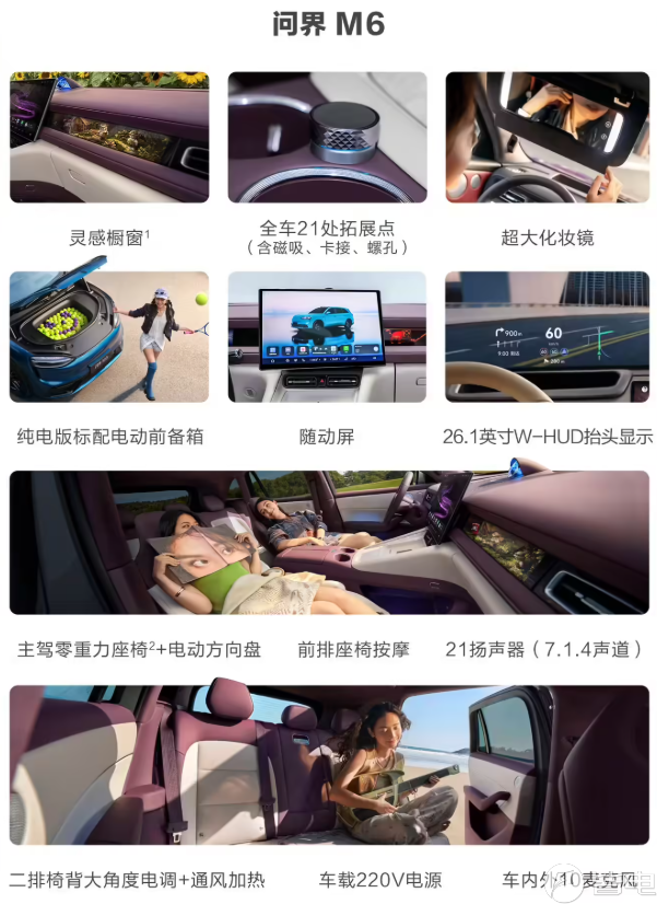 座椅配置上,车辆前排采用一体式运动化座椅,配备加热、通风、按摩功能,还支持一键躺平模式;后排座椅靠背支持29°-42°电动调节,同样配备加热和通风功能,同时提供小桌板、车载冷暖箱、17.3英寸吸顶屏。影音体验方面,问界M6全系标配21扬声器HUAWEI SOUND音响系统,搭配车内4麦克、车外6麦克的配置。