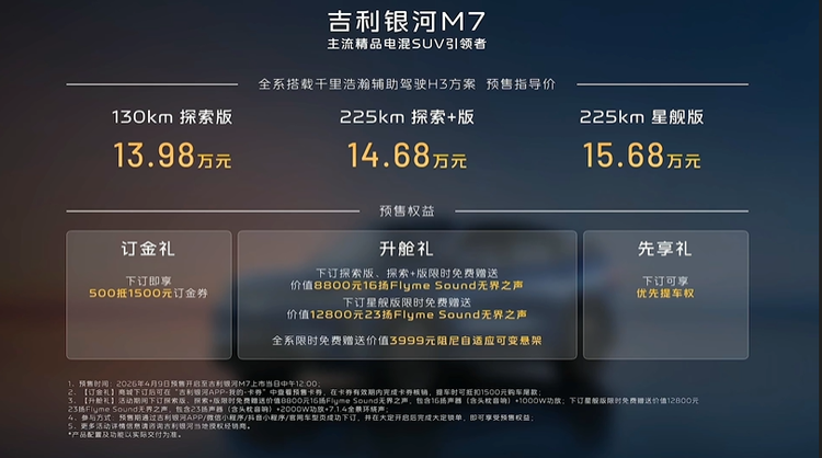 从13.98万元的起售价来看,银河M7在空间和舒适性上的投入,瞄准的是家庭用户的真实使用场景。它不是单纯堆砌轴距数字,而是在上下车便利性、储物灵活性、座椅舒适度、车内静谧性这些细节上逐一打磨。700L的后备箱和30处储物空间,解决的是日常出行的装载焦虑;十层座椅和双层玻璃,解决的是长途乘坐的疲劳和噪音问题。对于一台定位“主流精品”的家用SUV来说,这些“隐性”的舒适体验,可能比零百加速成绩更能决定一台车的日常口碑。