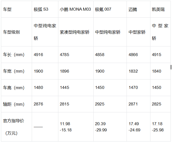 要知道,这个尺寸不仅比市面上多数热销的10万级纯电家轿大一圈,甚至超越了凯美瑞、迈腾等经典燃油B级车。这意味着,以前要花二十万才能拥有的中型车空间,现在极狐S3用10万级就给你了。即便把它和不少热门中大型轿车放在一起,尺寸也基本相当。