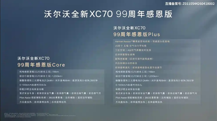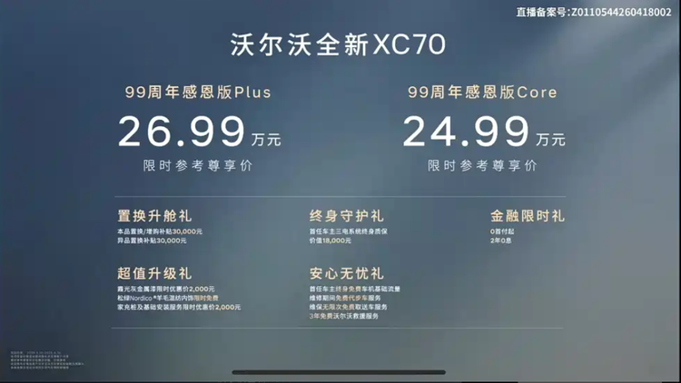 在当前插电混动SUV市场逐步向高配置和高效率靠拢的背景下, 沃尔沃XC70(参数|询价) 99周年感恩版的推出并没有对价格体系做明显调整,而是将重点放在配置补强上。新车提供两个版本,价格区间为24.99-26.99万元,变化集中在智能辅助和舒适性配置层面。从产品策略来看,这种“价格稳定+配置加码”的方式,更接近实际用车场景的优化,而非单纯拉高产品定位。