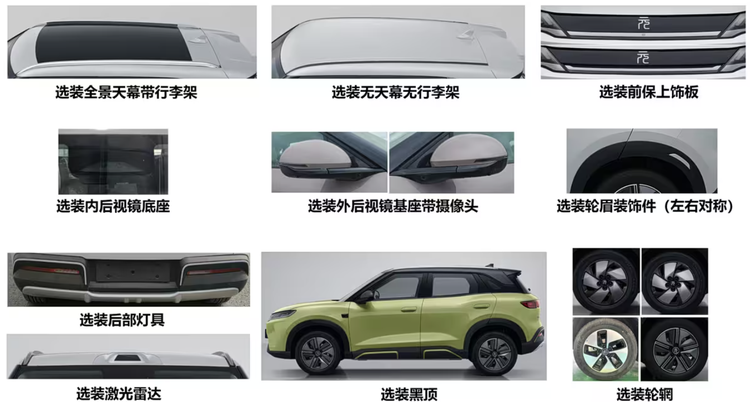 电池方面,对应42.313千瓦时与52.468千瓦时两种容量,续航里程分别达到410公里和505公里。选装配置方面,新车可选装全景天窗、前包围饰板、三视摄像头、轮眉装饰件、车顶激光雷达、双色车身以及多种样式的17英寸轮圈,进一步满足用户的个性化需求。
