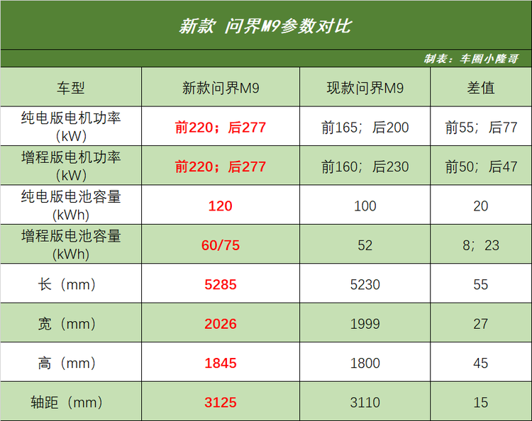 为了便于大家做对比,我整理了一些新款问界M9与现款的不同点,车身尺寸方面新车长宽高分别为5285/2026/1845毫米,轴距达到3125毫米。长宽高产生变化,可以通过外饰件达成,但轴距增加了15毫米,那就不是简单的修修改改了,新款M9可能是采用了全新的架构打造,但不排除在原来的架构上重新整改的。