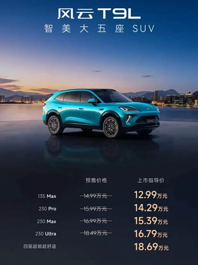 4月13日,奇瑞风云 T9L在重庆正式上市,该车定位 “智美大五座 SUV”,推出了135Max版、230Pro版、230Max版、130Ultra版和四驱高配版,价格区间12.99-18.69万元。