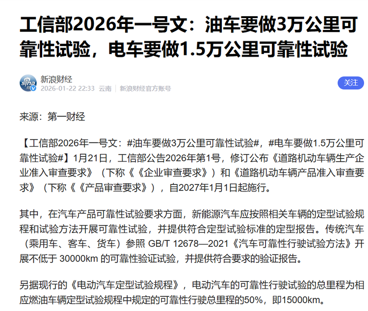 事实上,从目前的信息来看,国内应该并没有哪款车型能够仅靠虚拟测试就上市。而且,2026年出台的新规,更是将可靠性试验明确为准入硬门槛——传统汽车不低于3万公里、电动汽车则需完成1.5万公里。