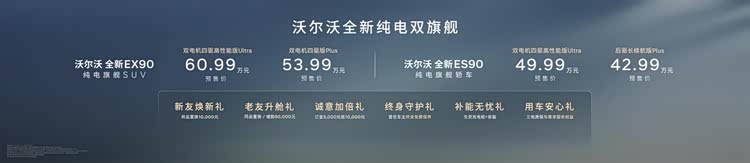 车家号·0浏览·2026-04-16 08:14 · 北京4月15日,沃尔沃汽车99周年庆典上,全新纯电旗舰SUV EX90与轿车ES90正式开启预售。EX90双电机四驱版预售价为53.99万元起,ES90后驱长续航版预售价为42.99万元起。两款新车基于SPA2原生纯电平台打造,不仅传承了沃尔沃99年的安全基因,更将北欧豪华与纯电科技完美融合。