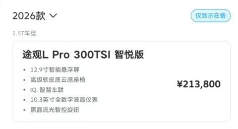 近日,2026款 上汽大众途观L(参数|询价)Pro 300TSI智悦版车型上市,官方指导价为21.38万,定位为途观L Pro入门版车型。