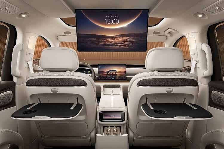 在大多数中国人的印象里,车越大就应该越豪华,光看零跑D19的尺寸,就挺有气场的,超5米2的车宽和3110mm的轴距,均不输问界M9。虽然零跑D19用的还是那套家族式设计语言,但为了契合定位,加入了百万像素DLP投影大灯ISD智慧交互灯幕,智能防炫目远光、窄道示宽光毯、礼让行人动画、泊车领航投影、露营观影投放等功能一应俱全,同时联动车内60英寸AR-HUD+21.4英寸娱乐屏+17.3英寸中控屏等五大屏,还能实现车内外“光影秀”,豪华而不失个性。