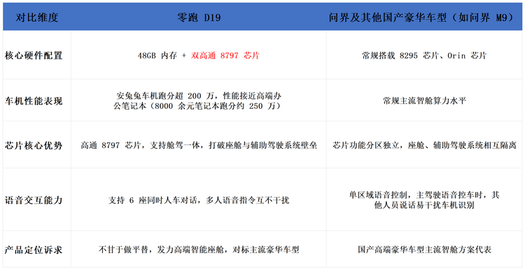 当然零跑并不想只当别人的平替,所以在问界拿手的智舱这块,零跑这次也是豁出去了,新车D19搭载48GB内存+双高通8797芯片,最近官方公布了零跑D19在安兔兔车机跑分超过200万,什么概念呢?我剪视频用的8000多笔记本的跑分大概才250万左右。而且与问界M9等其他国产豪华汽车常用的8295芯片、Orin芯片有所不同的是,8797芯片作为芯片,可以打破传统座舱与辅助驾驶系统各自为营的壁垒,也就是实现“舱驾一体”,比如问界M9主驾驶使用语音控车时,其他人就得“禁言”,否则车机就会听不清或者听不懂,而零跑D19可以做到6座同时人车对话。