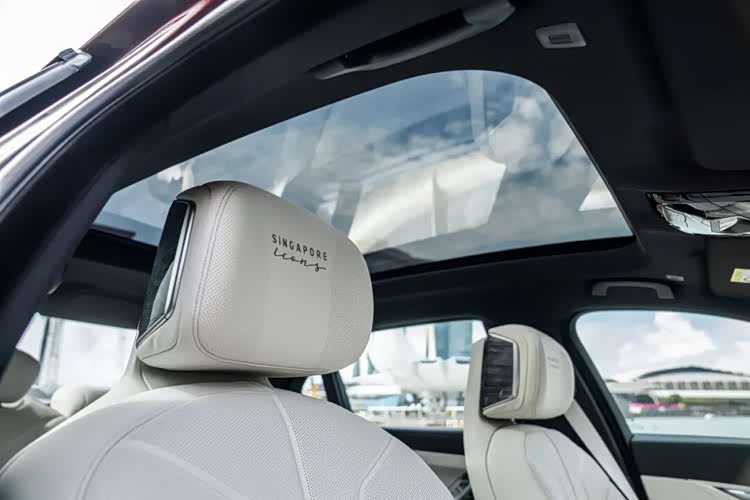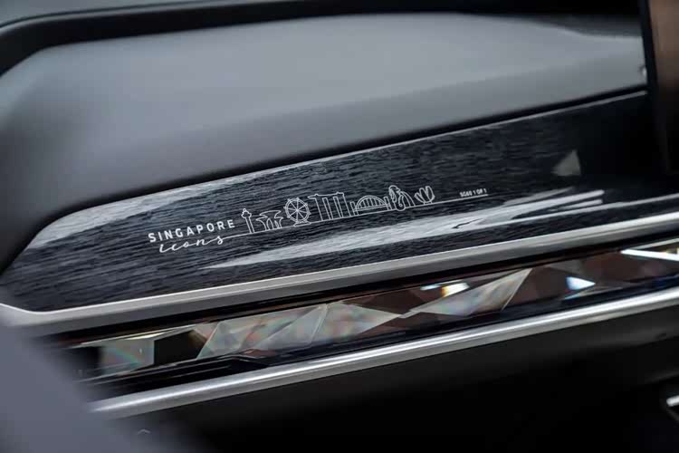 车漆颜色为马德拉红 (Madeira Red) ,源自劳斯莱斯的颜色库,车漆代码R20。轮毂为21英寸的1055型。车厢内部副驾驶前方带有专属的新加坡建筑图案,这个可就尊了哦,它是用一块宽27.5厘米、厚度不到1毫米的金属激光切割而成的。另外前后头枕处也有专属的字样。G90 M5
