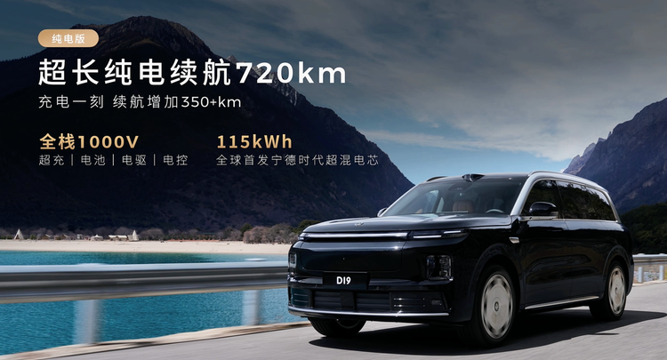 动力方面,零跑D19提供增程版和纯电版两种选择。增程版搭载1.5T增程器,全系配备前后双电机四驱系统,电机总功率300kW(前100kW、后200kW),储能装置有两种组合,分别是63.7kWh+52L油箱和80.3kWh+40L油箱,对应CLTC纯电续航400km和500km,综合续航则分别为1300km和1180km。这款车首创增程CTC电池技术,搭配创新的门槛排气集成系统,最大化利用底盘空间容纳电池,增程版采用800V平台,30%-80%充电仅需15分钟。纯电版采用1000V高压平台,15分钟可补能350km以上续航。双电机版综合最大功率410kW(前180kW、后230kW),配备99.6kWh和115kWh两种容量动力电池,对应CLTC续航620km和720km;三电机版综合最大功率540kW(前180kW、后360kW),0-100km/h加速时间3.94秒,搭配115kWh动力电池,CLTC续航680km。底盘方面,该车采用前双叉臂、后五连杆独立悬架,全系标配CDC连续可变阻尼减振器;除入门版外,其余车型均配备双腔闭式空悬,可升高40mm、降低55mm,还支持主动魔毯预瞄、零动调头功能,顶配车型还能实现圆规掉头。此外,前四活塞制动卡钳、MK C2线控制动、博世R-EPS转向和LMC2.0底盘控制系统的配备,进一步提升了车辆的行驶质感和操控性。