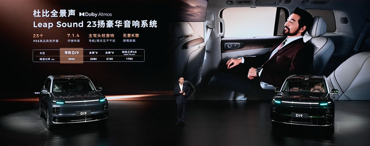 座椅配置上,零跑D19做到了全员兼顾。前排座椅标配电动调节、加热、通风、按摩、记忆以及方向盘加热功能,日常驾乘舒适度拉满。六座版的二排配备零重力座椅,支持120度零压躺姿和4向腿托,195mm的中央过道让上下车更便捷,二排右侧还支持电动横滑;七座版二排座椅椅背最大角度可达145度,支持一键折叠,两种版本的二排都标配加热、通风、按摩和记忆功能。三排座椅同样支持电动调节,椅背最大角度131度,一键折叠、座椅加热和记忆功能也没有缺席,此外,二排和三排电动遮阳帘为全系标配,进一步提升了后排的乘坐体验。后排配置同样丰富,配备6英寸多功能控制屏和21.4英寸3K电动娱乐屏,通过莱茵低蓝光认证,能有效保护视力;小桌板、8.1L冷暖箱(支持-6°C至50°C宽温域调节)、全景天幕和双层玻璃车窗等配置也一应俱全,兼顾实用性与舒适性。音响系统方面,该车标配23扬声器(含2个主驾头枕音箱)的Leap Sound音响系统,峰值功率达2304W,能带来不错的听觉体验。