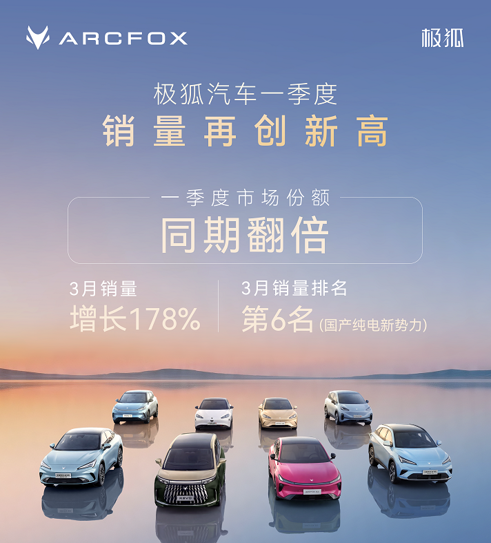 数据显示,一季度极狐汽车销量同比大幅增长,市场份额较去年同期翻倍,行业竞争力持续提升。其中3月份表现尤为突出,销量增长178%,品牌成功迈入行业第一梯队。