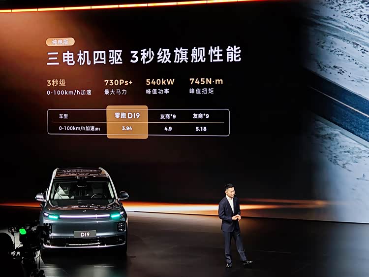 即便是纯电版本,零跑D19也延续了「堆料不抬价」的原则:115kWh纯电超混电芯带来700km的超长纯电续航,彻底解决纯电车型的续航痛点;顶配版搭载三电机四驱系统,百公里加速仅需3.94s,媲美百万级性能车型。
