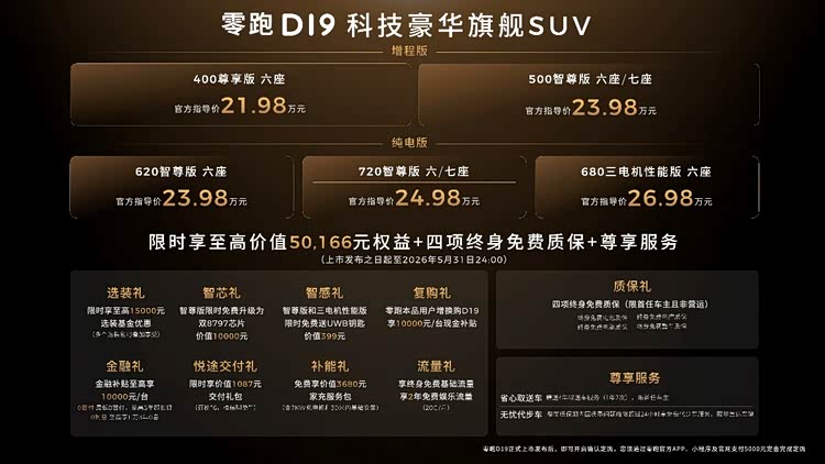 零跑D19的上市,不仅是零跑十年技术积淀的集中爆发,更标志着中国品牌在旗舰SUV领域完成了从“跟随”到“引领”的跨越。即日起至2026年5月31日,下定用户还可享受选装礼、智芯礼等至高价值50166元的限时权益。对于追求高价值体验的家庭用户而言,零跑D19无疑是一个极具吸引力的“破局者”。