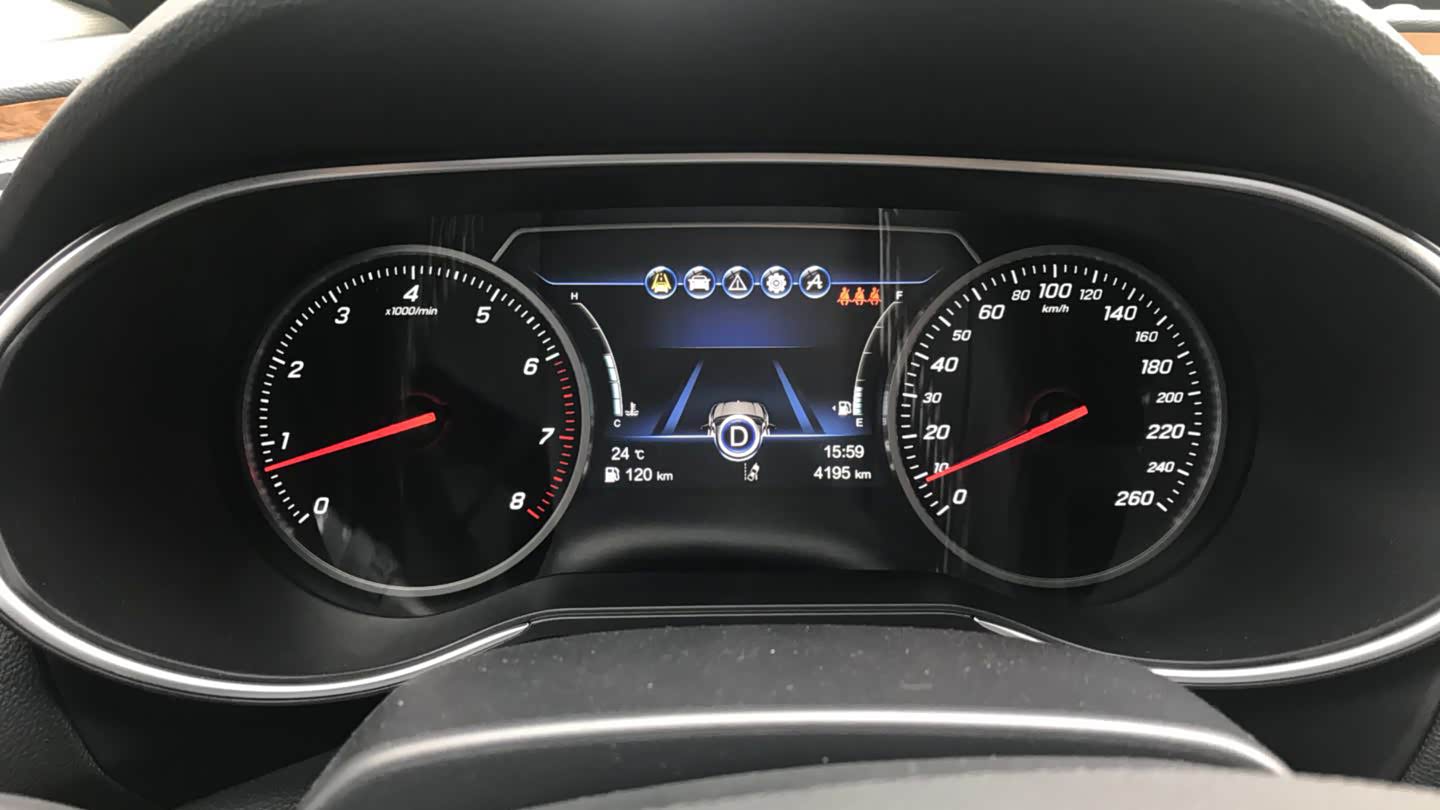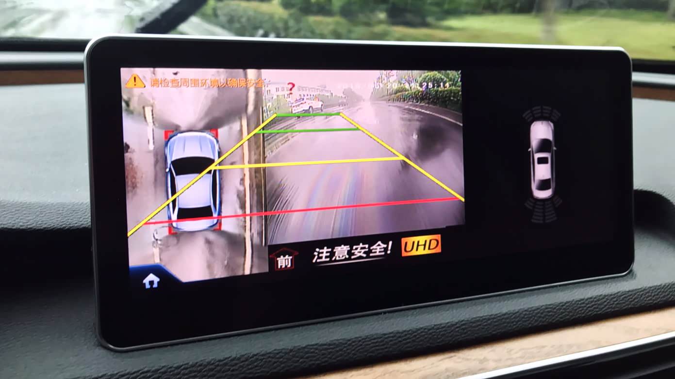 试驾车是顶配车型,配备了前6后6雷达,倒车影像,360度全景影像,以及车道偏离、盲点监测等高端辅助功能。但是这些功能配合得并不够好,比如有时候360度全景影像会占掉三分之一倒车影像的画面,提示信息也显得很凌乱。