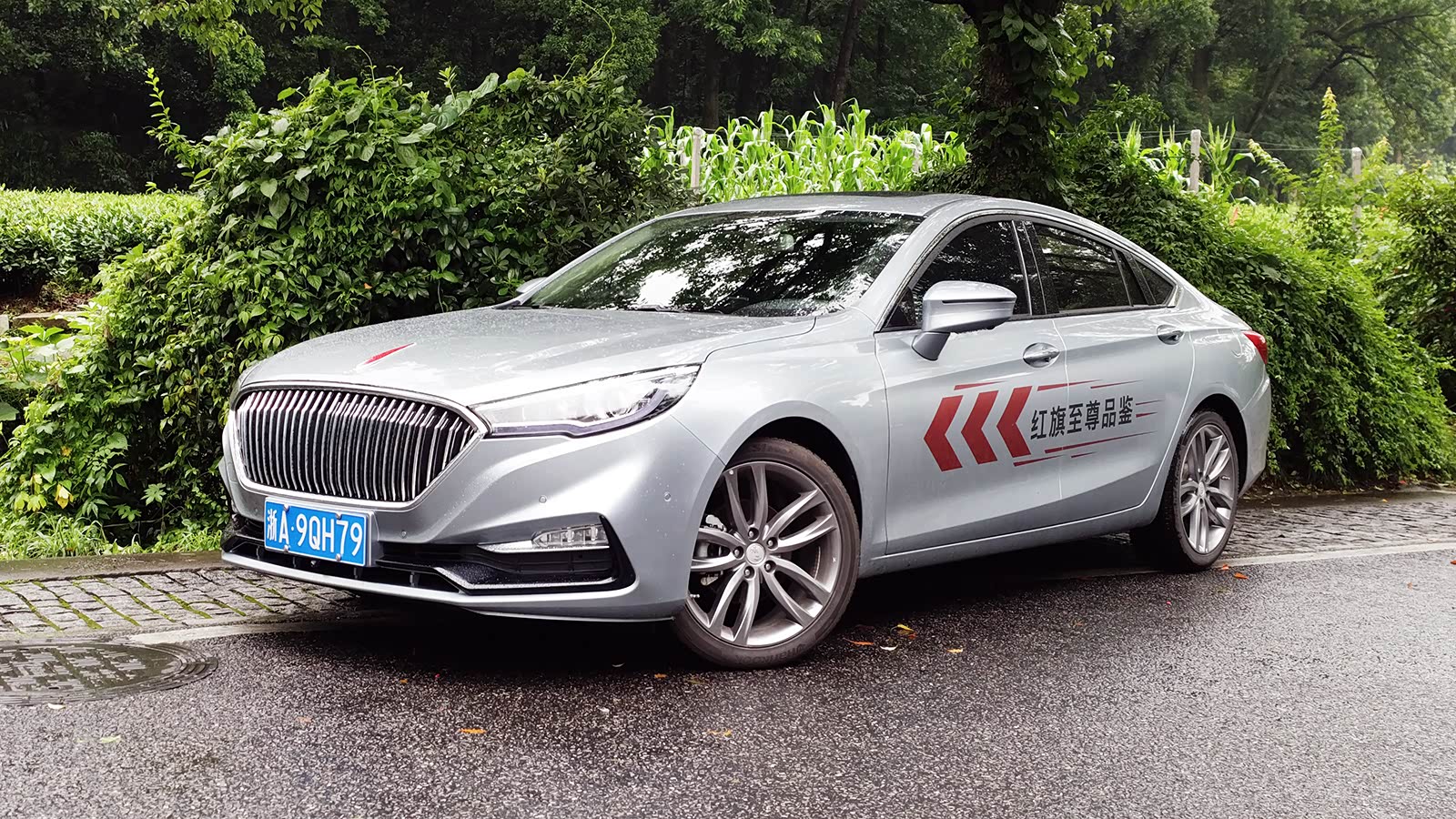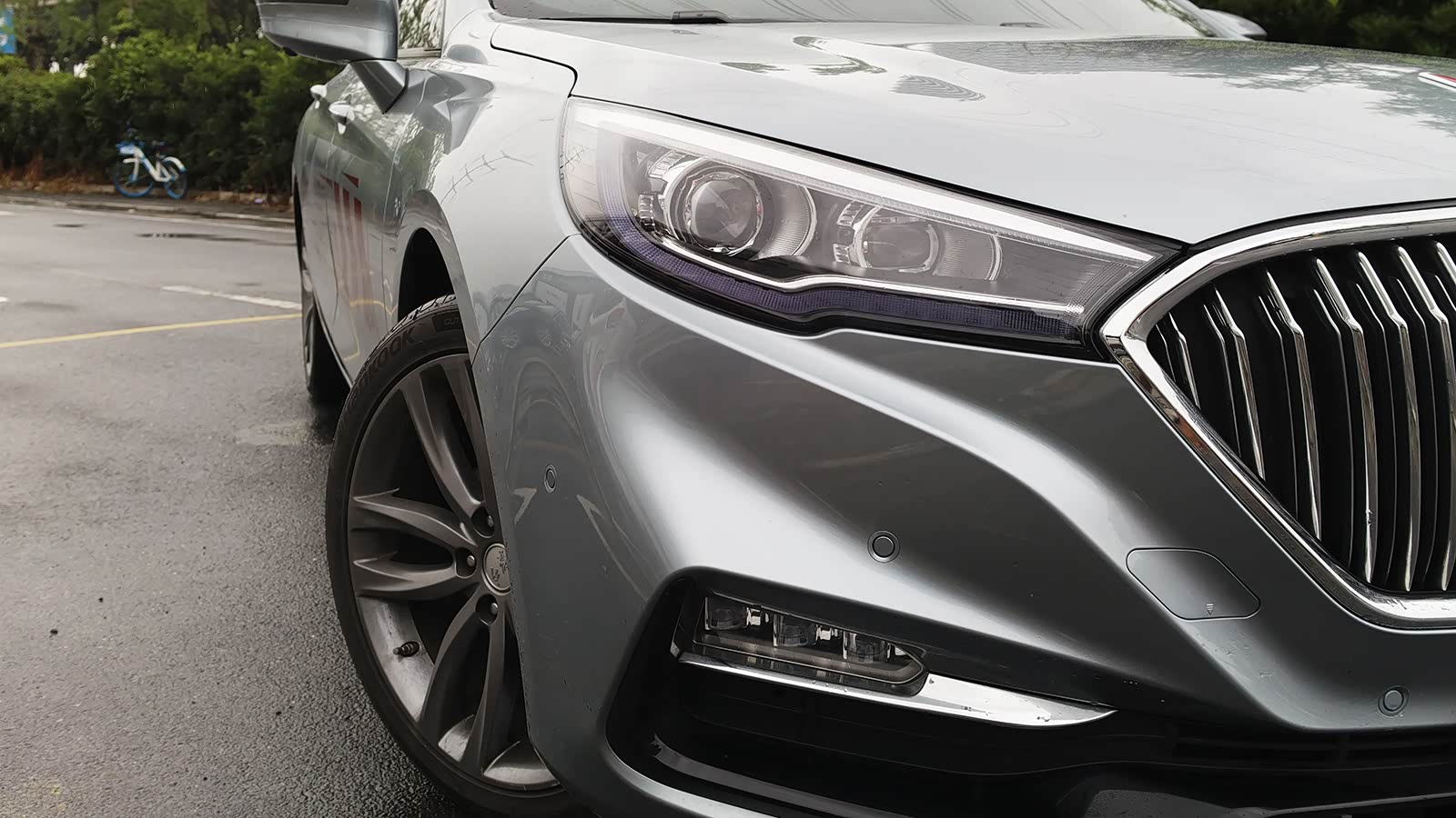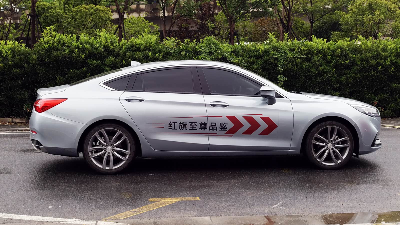 近年来多家的中级车都在往“轿跑风”上靠,红旗H5也不例外。来到侧面,整车侧面的线条非常流畅,很明显看到后挡风玻璃角度非常倾斜。后门之后配了一个小三角窗,并有镀铬点缀,整条镀铬一笔勾出了车窗的轮廓。侧面的两条线条横贯整个车门,并与车尾的“褶子”形成呼应,两个线条在车灯处形成交汇,设计的整体感很好,特于对于我这种处女座强迫症来说看得很舒服。