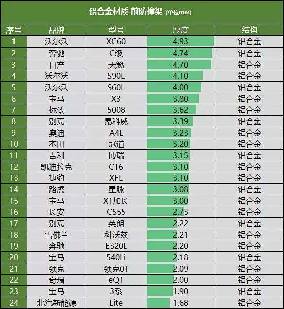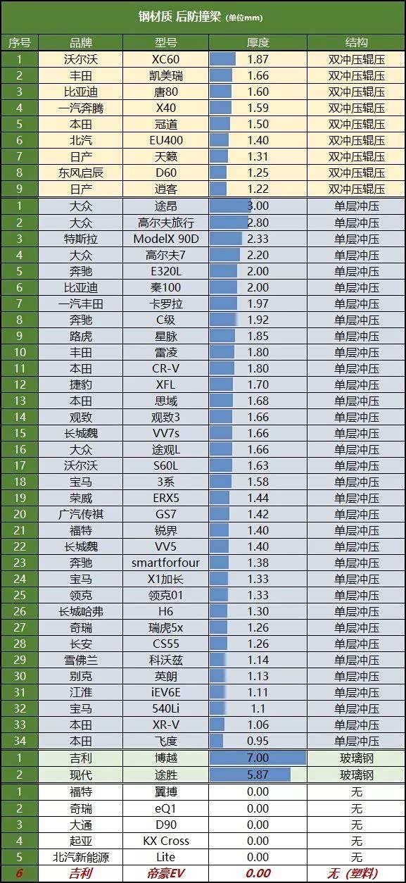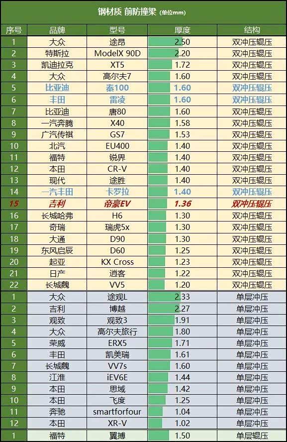 防撞梁的宽度能覆盖车头61.18%的面积,防撞梁厚度只有1.36毫米。一般来说,1.2毫米厚度是行业内的最低标准。在相同的结构下,帝豪的厚度最薄,不如原版的卡罗拉、雷凌,甚至不如另外的模仿者比亚迪。