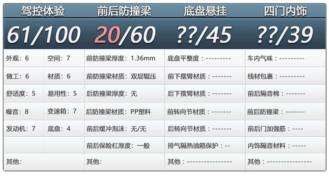 从这辆车防撞梁用料和结构来看,这辆车是模仿丰田九代花冠。前防撞梁虽然钢材厚度比较薄,但是幸好是双层辊压结构,弥补了一些强度的不足。但是后防撞梁竟然是塑料,确实令人惊讶不已!哪怕是玻璃钢,也算对得起良心。