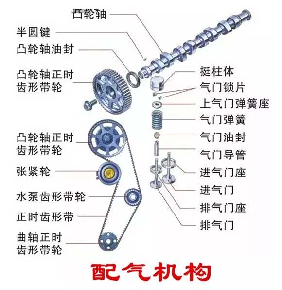 配气机构的功用是根据发动机的工作顺序和工作过程,定时开启和关闭进气门和排气门,使可燃混合气或空气进入气缸,并使废气从气缸内排出,实现换气过程。现在发动机的配气机构越来越复杂,目的就是让更多的空气进入气缸参与燃烧,以提高发动机的功率和效率。它主要由凸轮轴、气门、气门挺杆等组成。