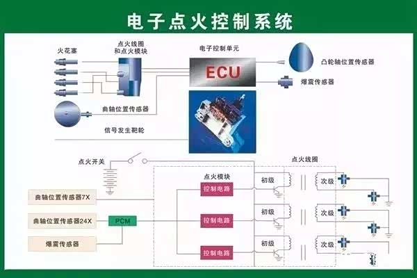 在汽油机中,气缸内的可燃混合气是靠电火花点燃的,为此在汽油机的气缸盖上装有火花塞,火花塞头部伸入燃烧室内。能够按时在火花塞电极间产生电火花的全部设备称为点火系,点火系通常由蓄电池、发电机、分电器、点火线圈和火花塞等组成。柴油机是压燃的,所以没有该系统。