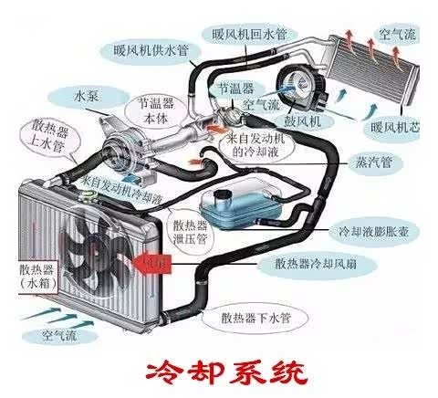 冷却系的功用是将受热零件吸收的部分热量及时散发出去,保证发动机在最适宜的温度状态下工作。水冷发动机的冷却系通常由冷却水套、水泵、风扇、水箱、节温器等组成。