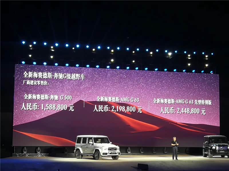 本次梅赛德斯-奔驰G级共推出梅赛德斯-奔驰G 500、梅赛德斯-AMG G 63和梅赛德斯-AMG G 63先型特别版三款车型,厂商建议零售价分别为人民币1,588,800元、人民币2,198,800元和人民币2,448,800元。