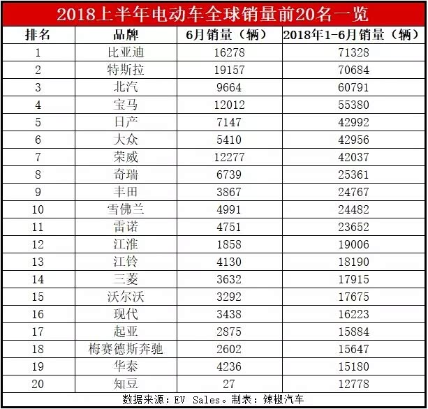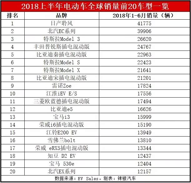 根据EV Sales网站公布的全球电动车销量数据,今年上半年,比亚迪以71,328台的累计销量,摘得全球电动车品牌销量第一名。但在全球电动车前20名车型中,比亚迪销量最大的车型——秦插电混动版也只是排在第五名,销量既低于纯电动车日产聆风、北汽EC系列和特斯拉Model 3,也低于丰田普锐斯插电混动版。而比亚迪销量最好的纯电动车e5,更是排在第12名,不仅销量落后于国外品牌,也赶不上国产品牌江淮iEV E/S,更是远远落后于北汽EC系列两倍多。