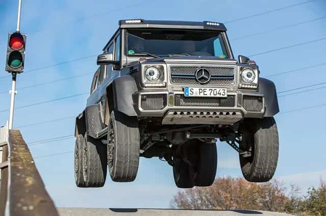 2、G63 AMG 6X6:所谓6X6的意思是它共有6个车轮并6车轮都参与驱动,由于车轮数量的增多差速锁数量也加至5把,另外G63 AMG 6X6的离地间隙也拉高至半米,在一台双涡轮增压V8发动机的推动下,这个六轮大G百公里加速可以在7秒内完成。