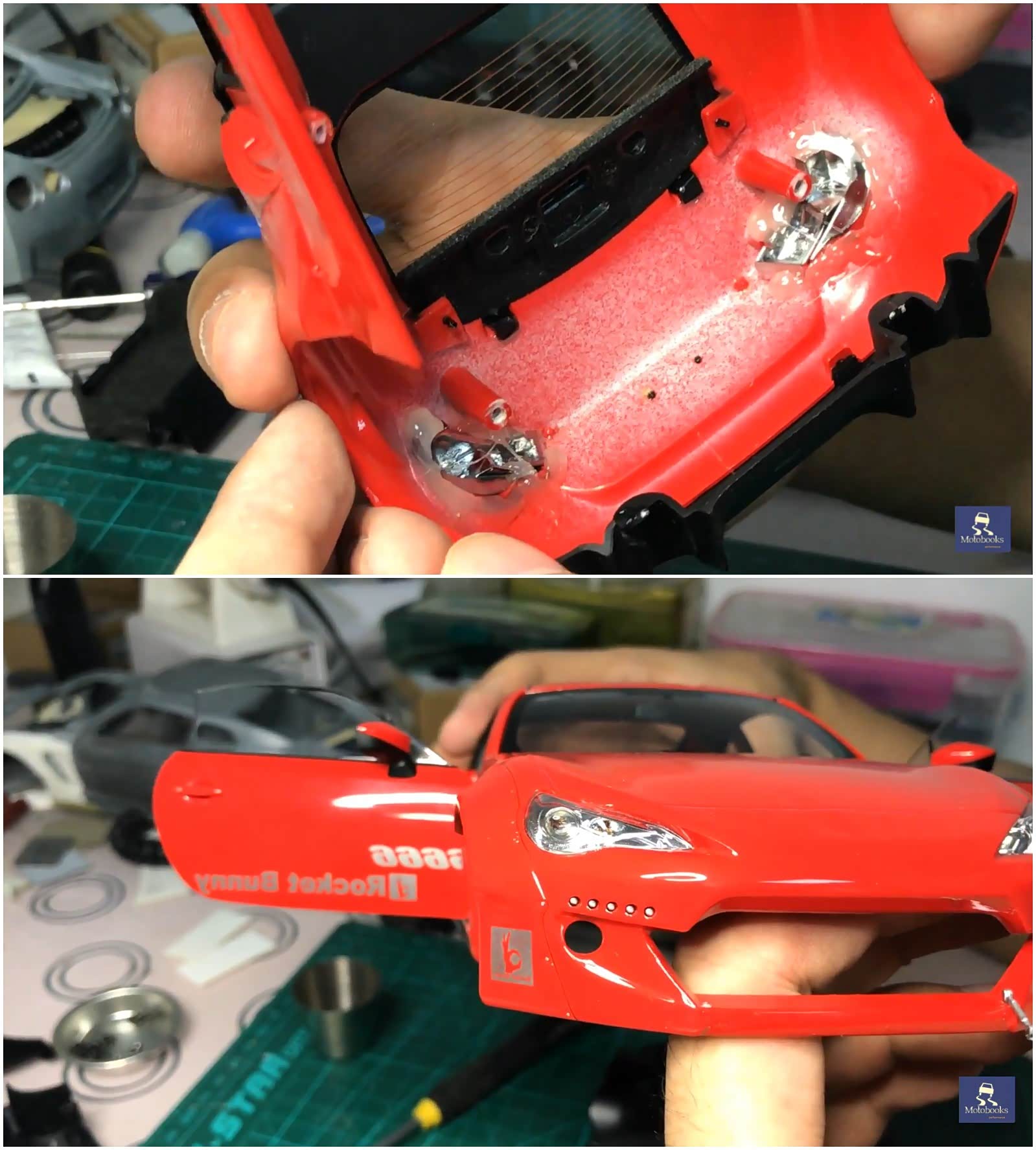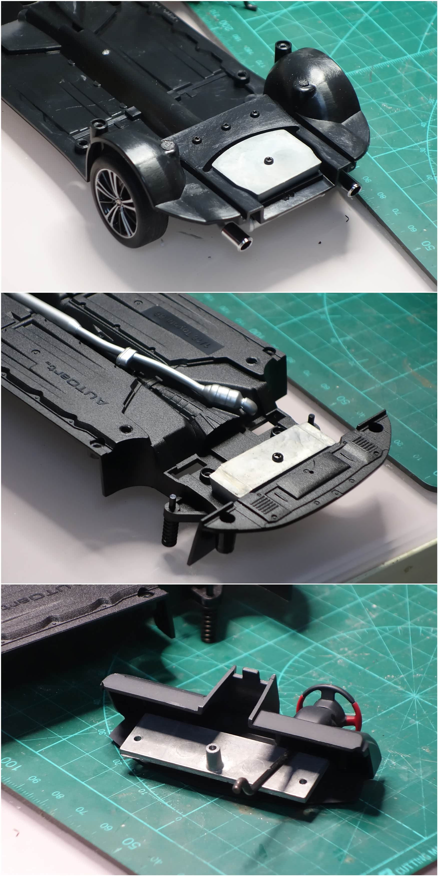 但我们发现:在复合材料宽体 GT86 汽车模型上并没有配重块,“压手” 的分量全部来自底盘上的金属部分。也就是说,为了造塑料 GT86 车模 AA 还特意重新设计了相关零件的结构,之前我们认为的零件通用看样子没有出现在主体部分。