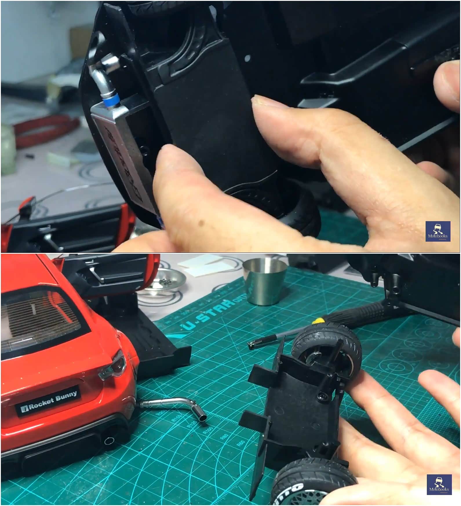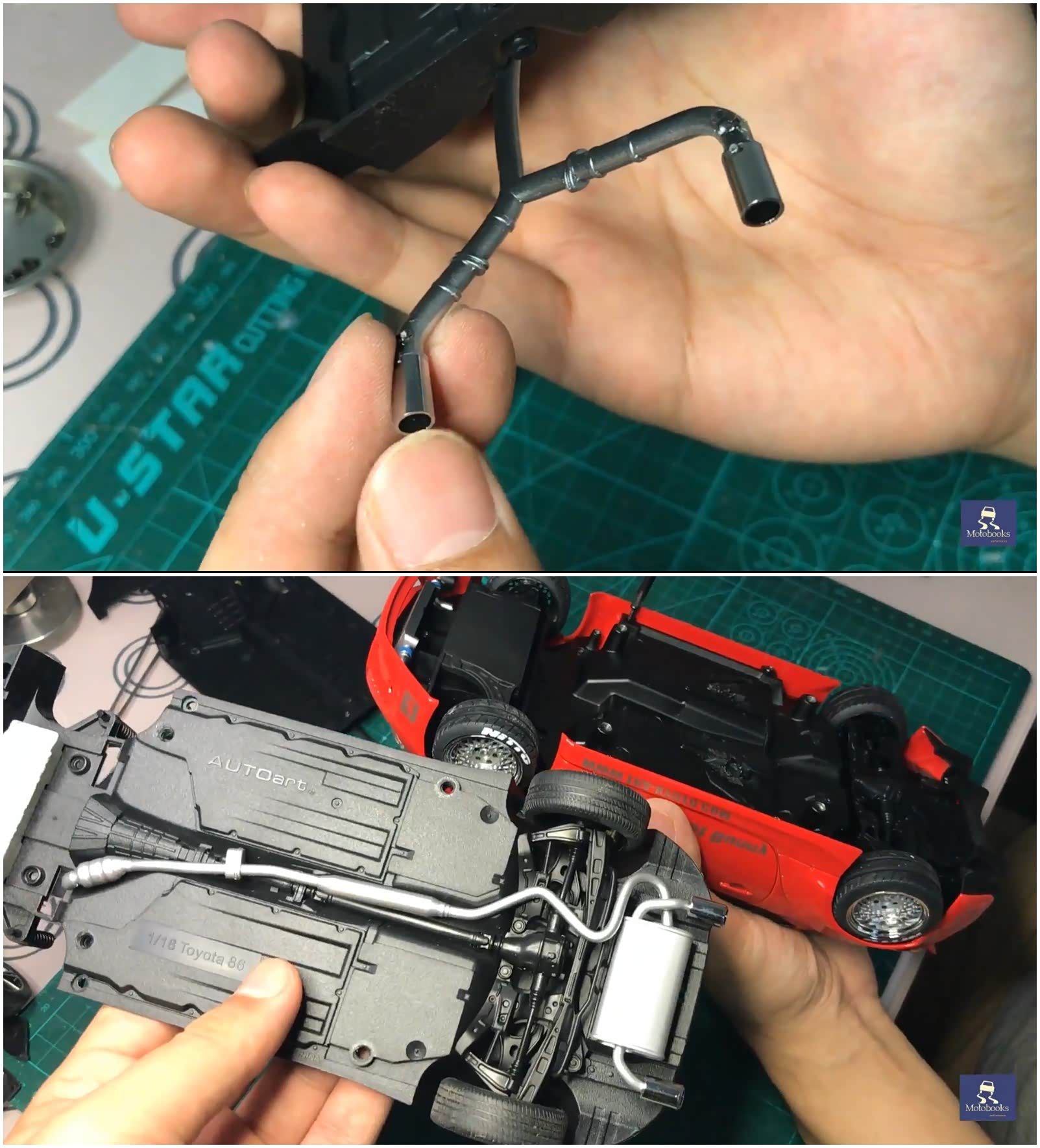 火箭兔宽体 GT86 汽车模型的尾喉部分改为直排,与原厂式样略有不同。排气末段镀铬部分是金属材质零件。从上下两图可以很明显的观察两车底盘的区别。