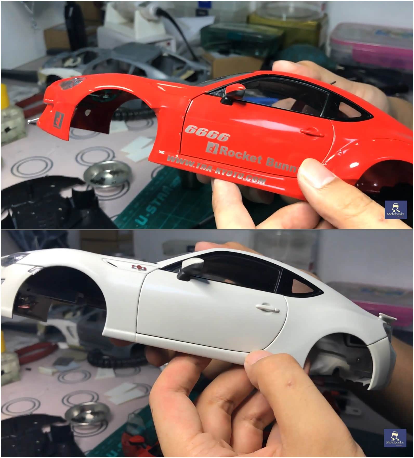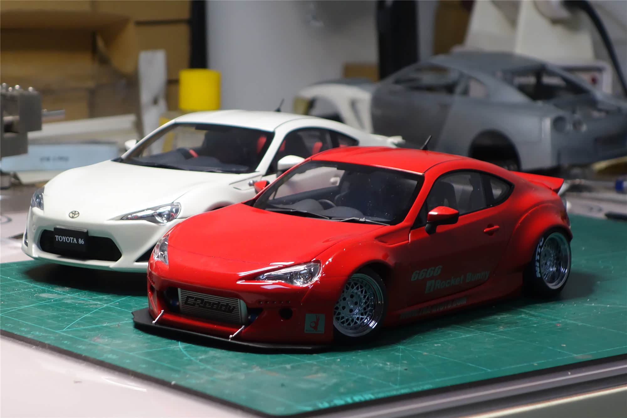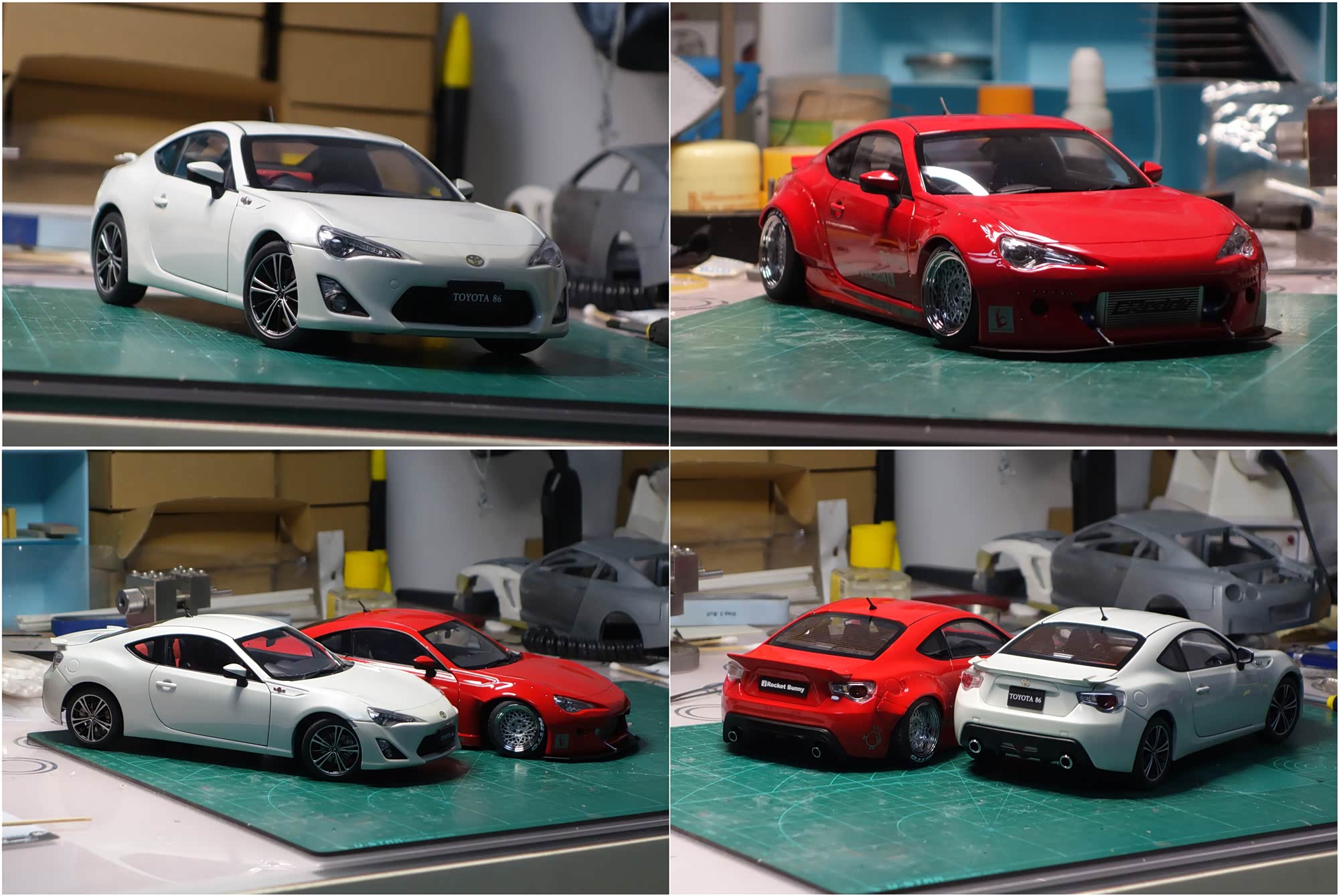 两台车模都是来自模型大厂 AUTOart,一台是合金全开工艺的丰田 GT86 原厂式样汽车模型(珍珠白),另一台是复合材料两开门工艺的 Rocket Bunny 火箭兔宽体改装丰田 GT86 汽车模型(红),模型比例均为 1:18。为什么拆这两台车呢?话说当年 AA 宣布宽体 86 将推出时,玩家们纷纷猜测新车将沿用现有的合金工艺,可塑料实车的上市打破了 JDM 爱好者们的梦 ... 其实我们这么猜测也是有一定道理的,本期节目的开始也对此做了一番讨论,对不对的请业内大佬指点一二。话说前头:本期节目是以科学和研究为目的,并不希望引出如 “甜咸之争” 的争论。孰好孰坏,自己把握。