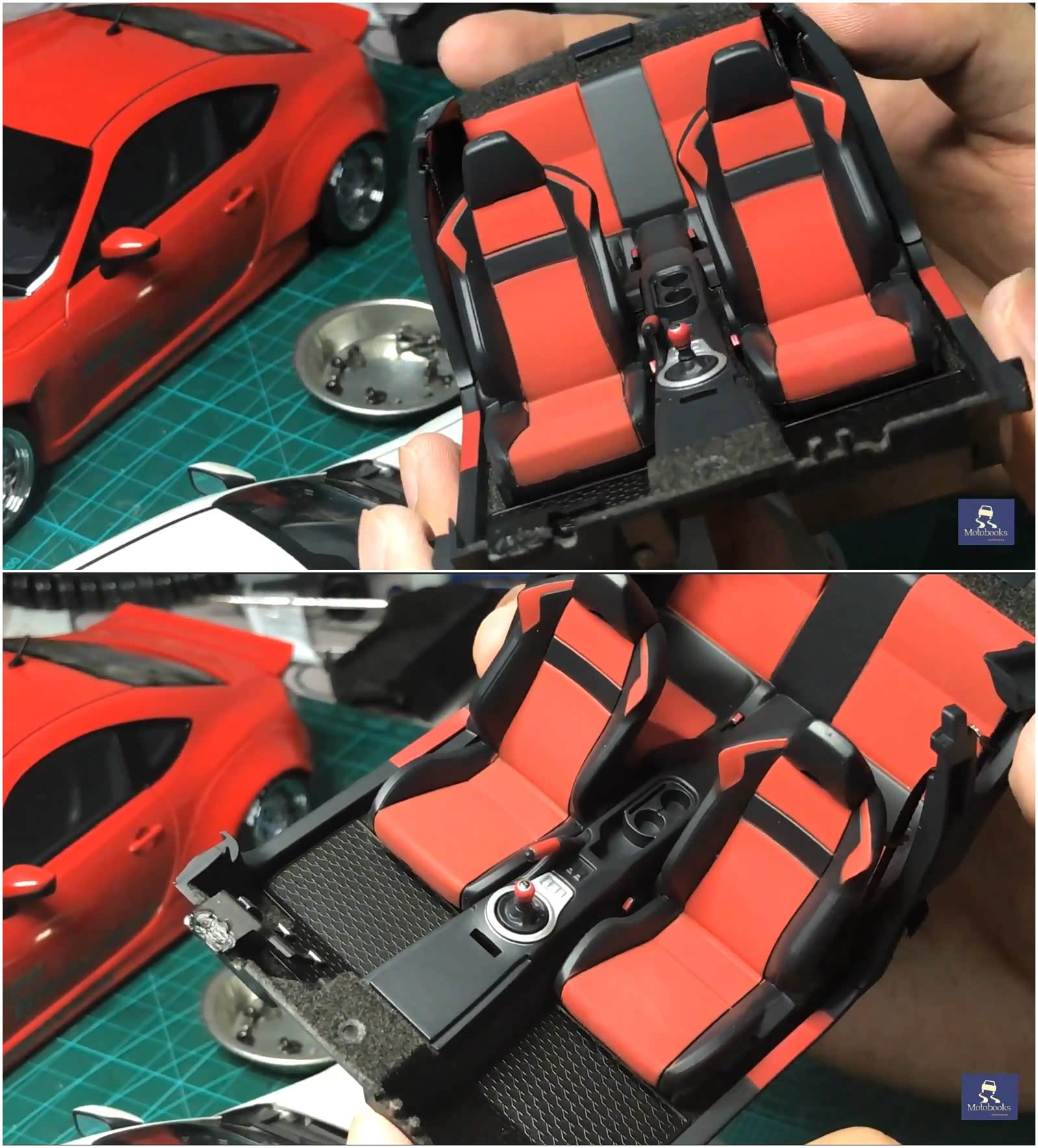 内饰部分前后可谓空空如也,因为不能打开发动机盖和后备箱盖,所以 AA 就将内部的细节完全省略。宽体 GT86 的座椅更换为桶形赛车座椅,安全带也更换为赛用安全带(胶皮材质),安全带末端的固定位大大方方地选在了尾箱位底板上,反正你不拆车也看不见。