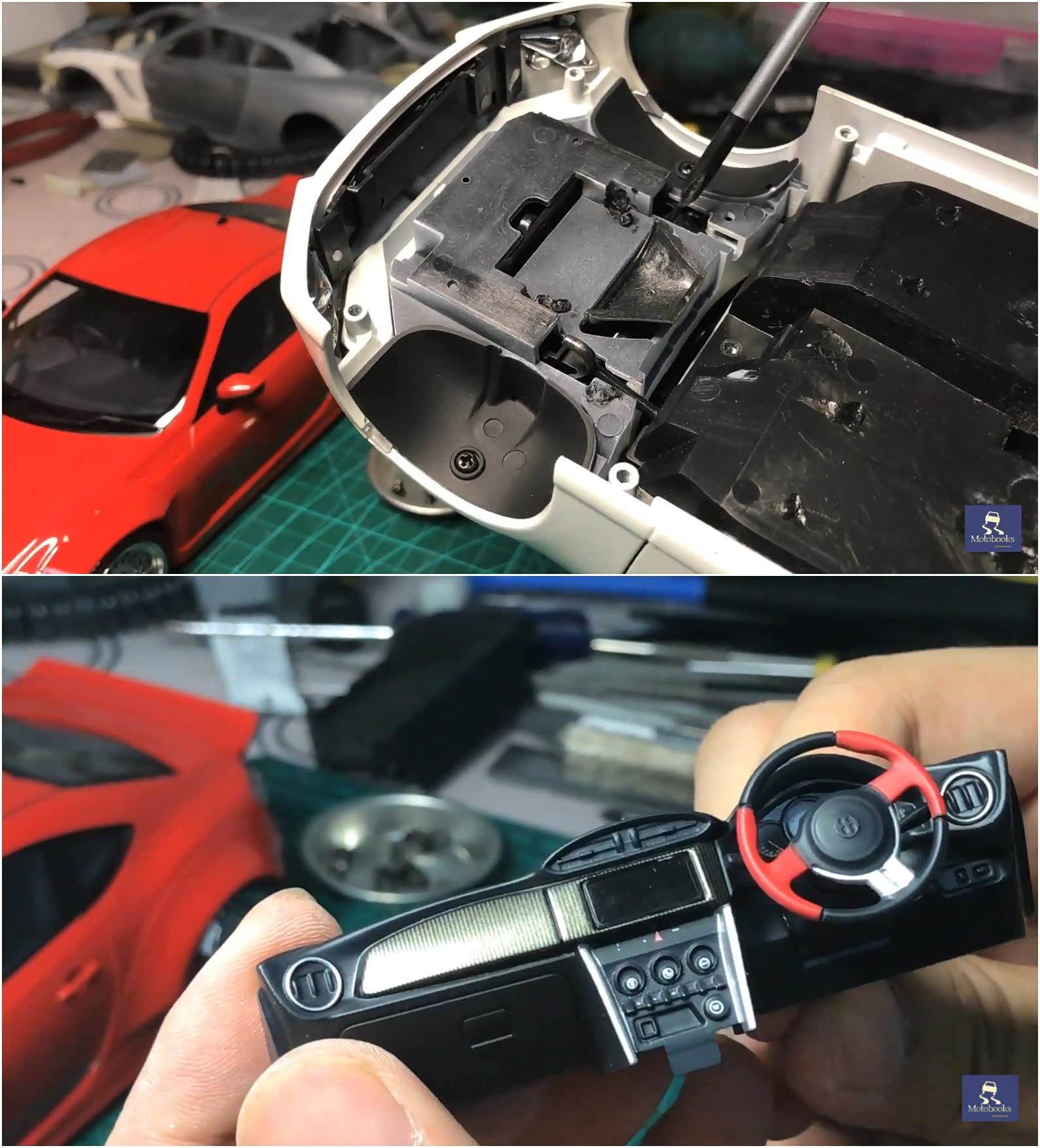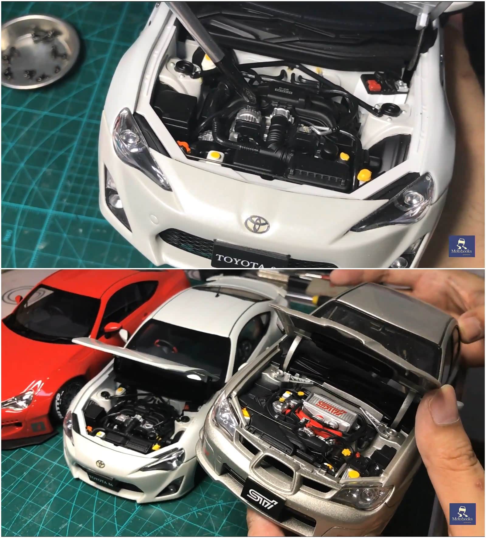 首先,我们先来拆合金的白色原厂(式样) GT86 吧!拆解过程波澜不惊,与之前节目中出现的 AUTOart 汽车模型拆解方式大致相同,没有什么特别需要注意的地方。不过拆开之后我们看到了 “不得了” 的玩意儿。