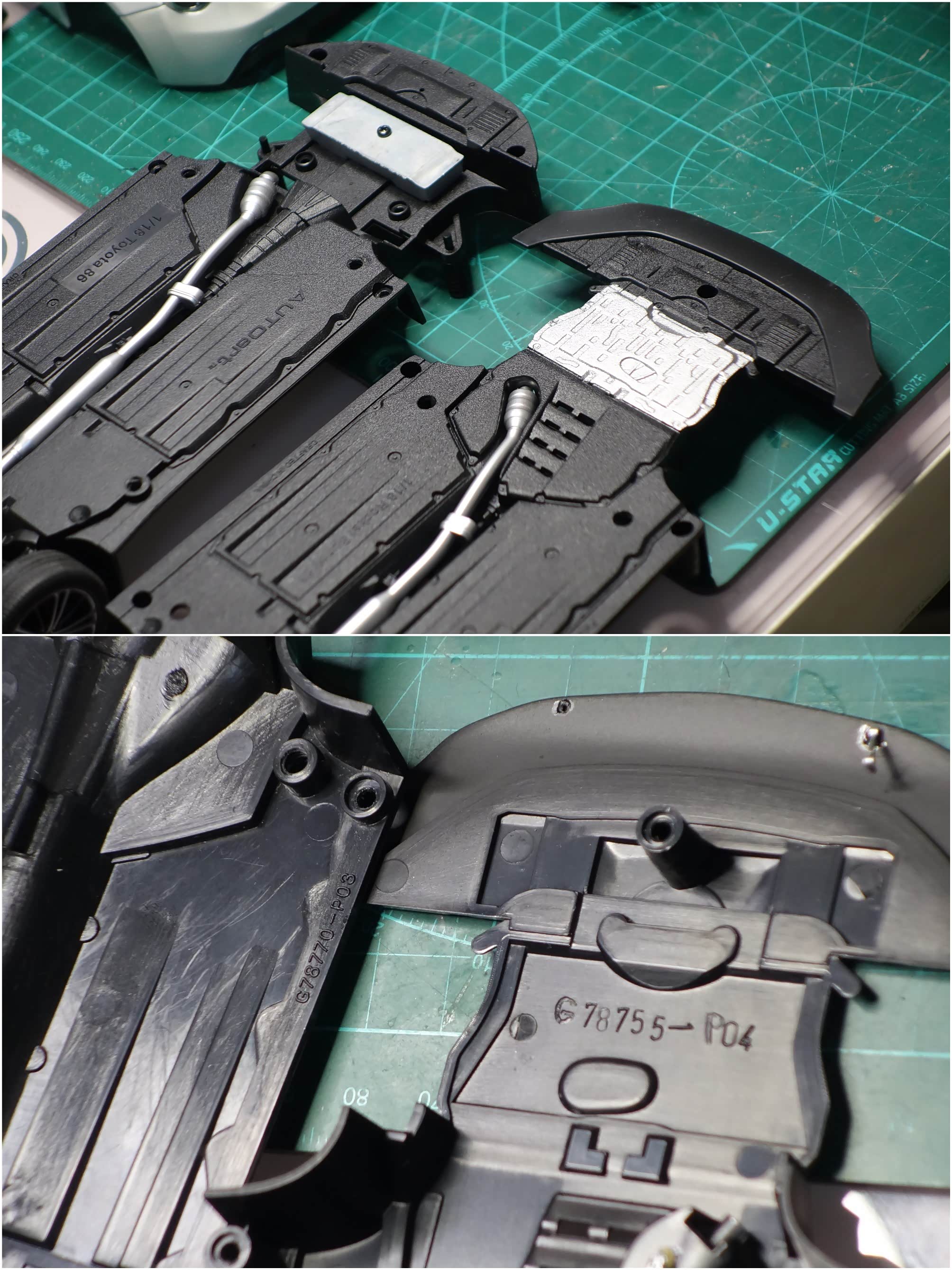 有意思的是我们在底盘零件的编号上还是找到了两车的 “近亲” 关系,编号前段都是 “G787”。但因为实车题材设定和材质更改的原因,两副底盘零件的区别是很大的。