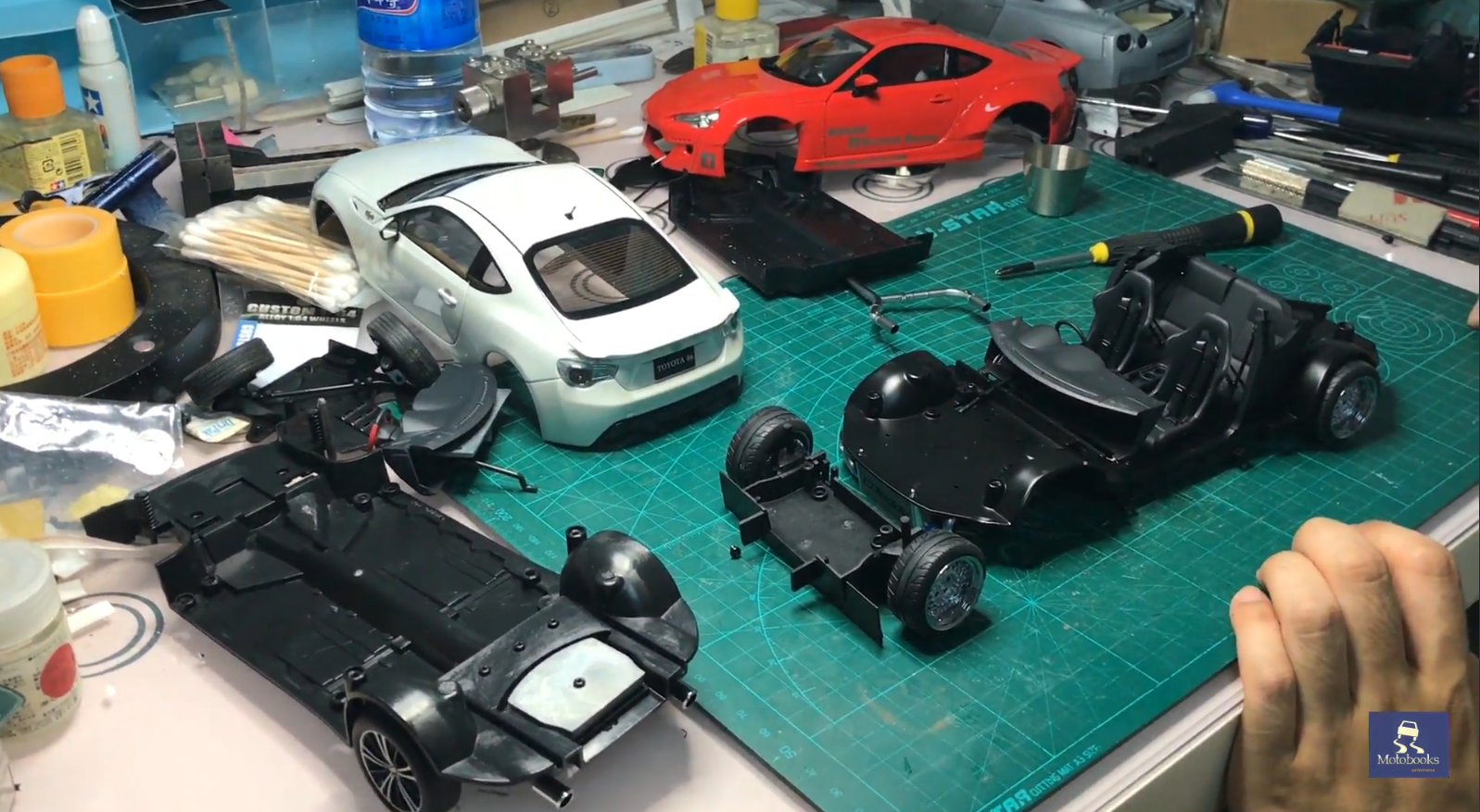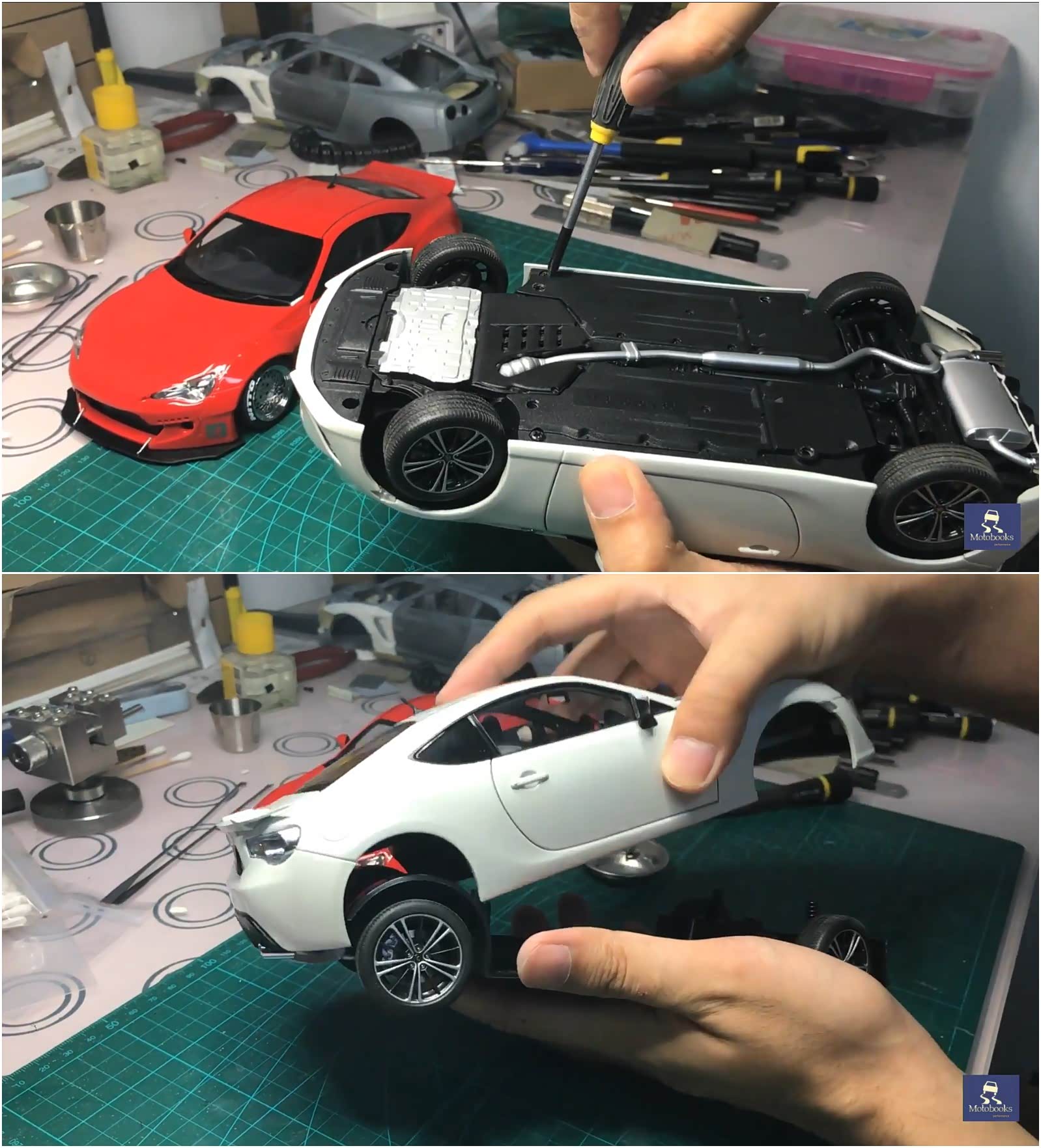 复合材料的宽体 GT86 汽车模型将四只车轮留在了内饰澡盆上,而不像合金版采用的分体结构。此底盘零件并不都是合金材质,为塑料与合金结合的工艺。