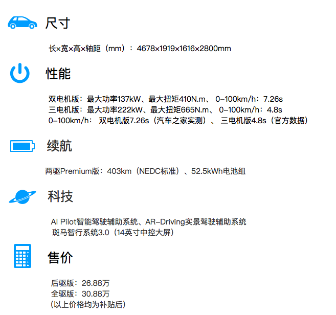 2、三电核心技术比较强,而且均衡。在加速性能、续航里程上都做到不错,没有明显弱点。