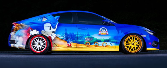 这台十代思域以“痛车”元素为基础,除了游戏主角索尼克之外,还有游戏中的场景,这辆索尼克思域除了黑色处理的中网,蓝色的BASF R-M Candy Sonic烤漆,以及索尼克代表色(黄色)烤漆的Honda Logo之外,还有呈现游戏中Sonic的红鞋和金环的专属轮圈单品。
