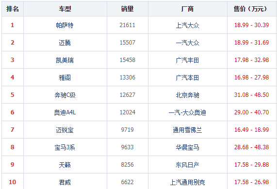 上面是B级车领域的月销榜单,前两名依然是大众双雄 帕萨特(参数|询价)和迈腾,看来日系车一浪接一浪的风头对大众没有丝毫的影响。尤其是帕萨特,在这种买车淡季还能交出月销量超过两万的成绩单,这么优秀的表现跟它的产品力肯定是密不可分的。既然帕萨特的受众群这么广,那我们这期就给大家带来帕萨特的养车成本分析,希望能帮助到想买车的你!
