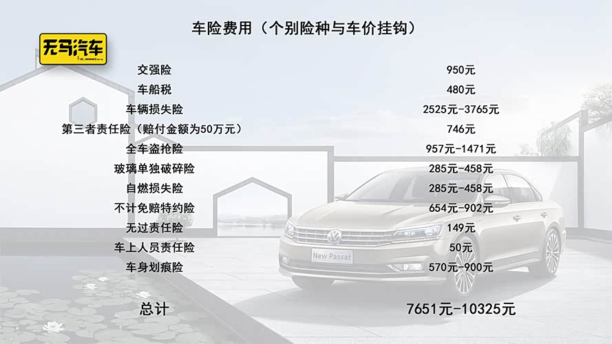 帕萨特的指导价为18.99-30.39万元,保险的价格因车价的不同而不同。入门车型新车的保险为7651元,顶配车型新车的保险为10325元。当然如果没有出险的话,后面的保险是会逐年下降的,因为这里算的是全险,所以会比较贵一些,我们就姑且先算每年的保险是7651元。