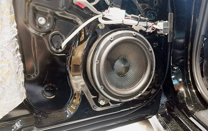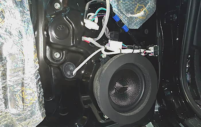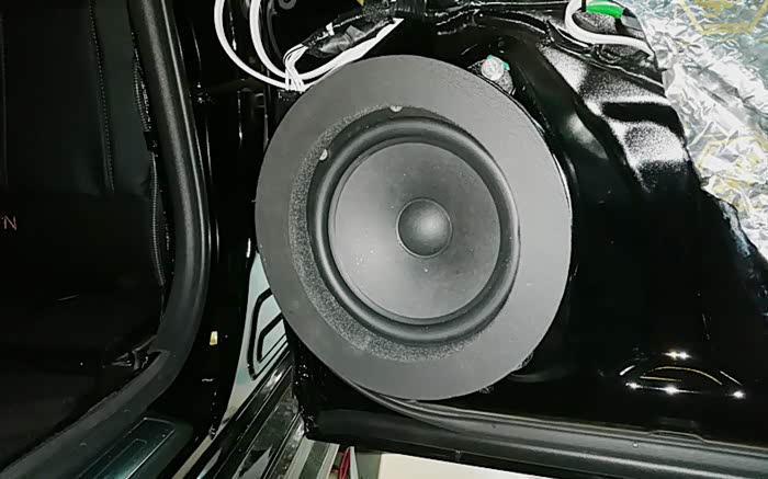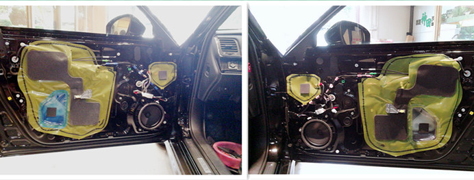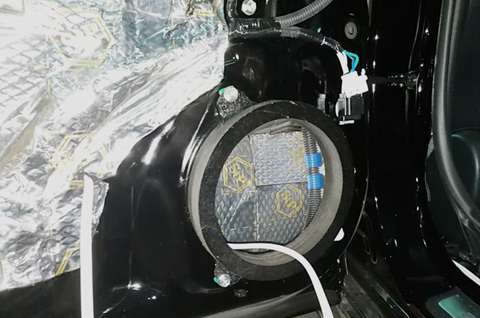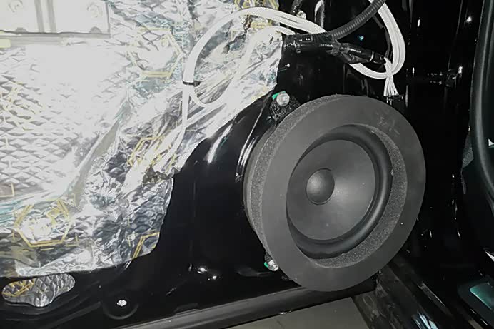 车门环境对喇叭的影响尤为重要,首先给车门进行减震板隔音处理,隔音减震材料采用俄罗斯进口Stp金卫仕航空隔音材料,粘贴在车门内侧的板金上,增添了门板板金的厚度,大幅度降低风噪的入侵,有效的抑制钣金共振,达了一个很好的降噪效果;