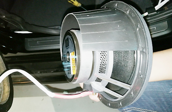 前声场法国BLAM165.100中低音喇叭安装完成效果;BLAM165.100中低音喇叭音盆采用高保真碳纤维网状盆腔设计,中间锥心盆显得更完美,人声的演绎自然而通透柔和细腻,平衡力度丰满,完全可以满足车主追求人声音效的要求;