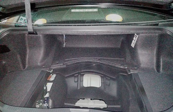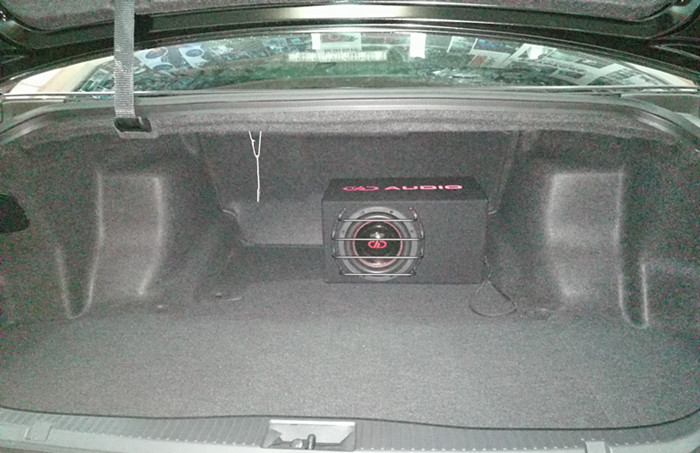 尾箱盖板盖上后的效果,功放隐藏式安装在备胎位置,尾箱看起来更整洁,美国DD 8寸超低音安装在后备箱,帮车主节省了不少空间!低音可以为音乐带来更宽广的音场延伸,更强劲有力的低音声压效果。