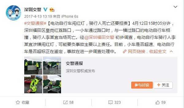 4月12日15时05分许,深圳福田区皇岗红荔路口,一小车通过路口时,与一横过路口的电动自行车相撞,骑行人李某宜当场死亡。经深圳福田交警 初步调查,电动自行车骑行人李某宜涉嫌闯红灯,可能要负事故主要以上责任。