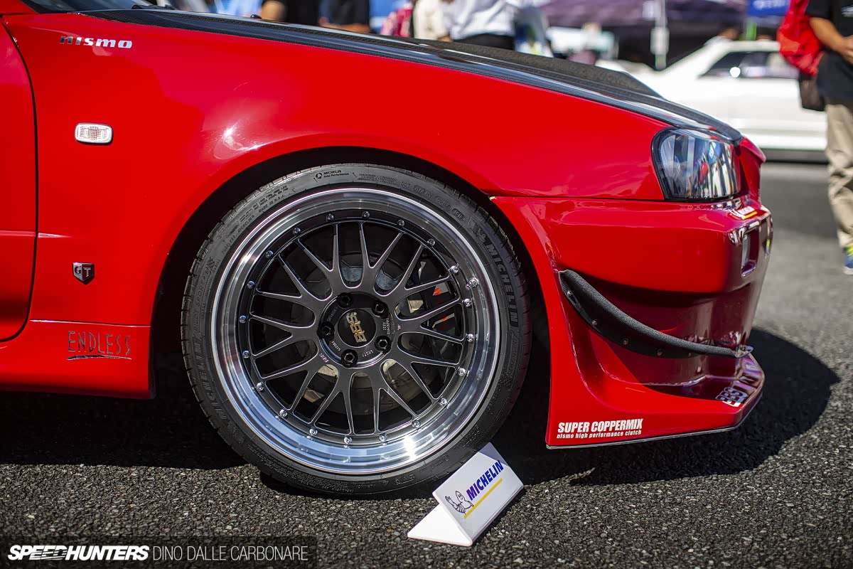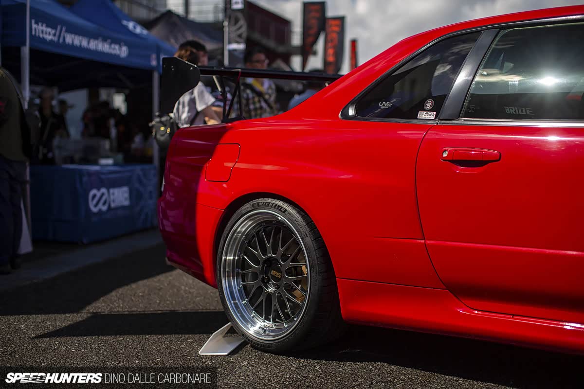 停在MCR旁边的是另一台红色BNR34,两者外观除了轮毂几乎一毛一样,但是MCR的保险杠装了Nismo的空力套件。这台34来自RGF,主理人Fukushima是Kobayashi的好朋友(怪不得两辆车这么像,原来是基友)。轮毂也用了以前MCR常用的Enkei,这台车选择了RS05RR。