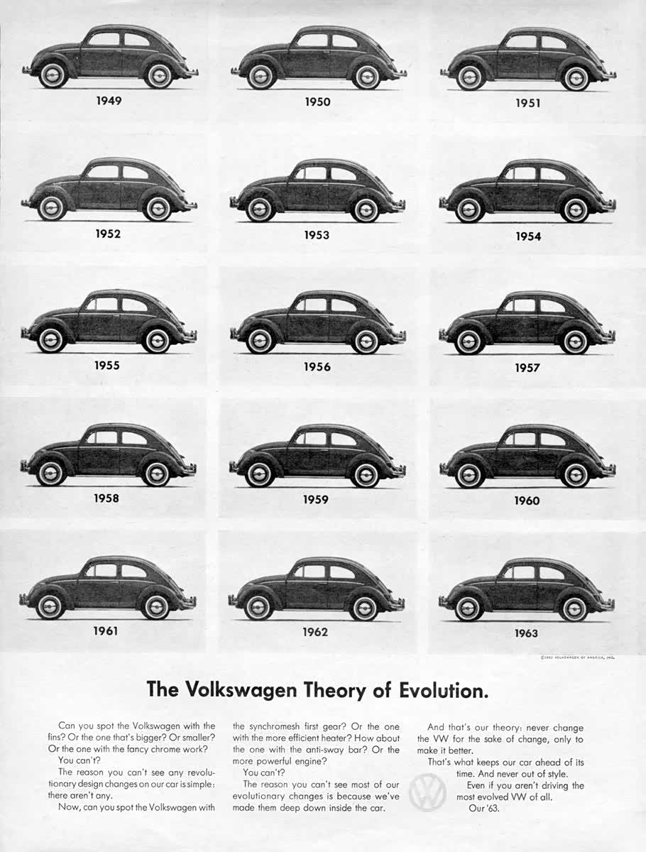 在 1933 至 1963 年期间,甲壳虫几乎没有任何设计或硬件上的更新。大众曾发广告自嘲,甲壳虫每一年的产品都是在对上一年的产品进行复制。