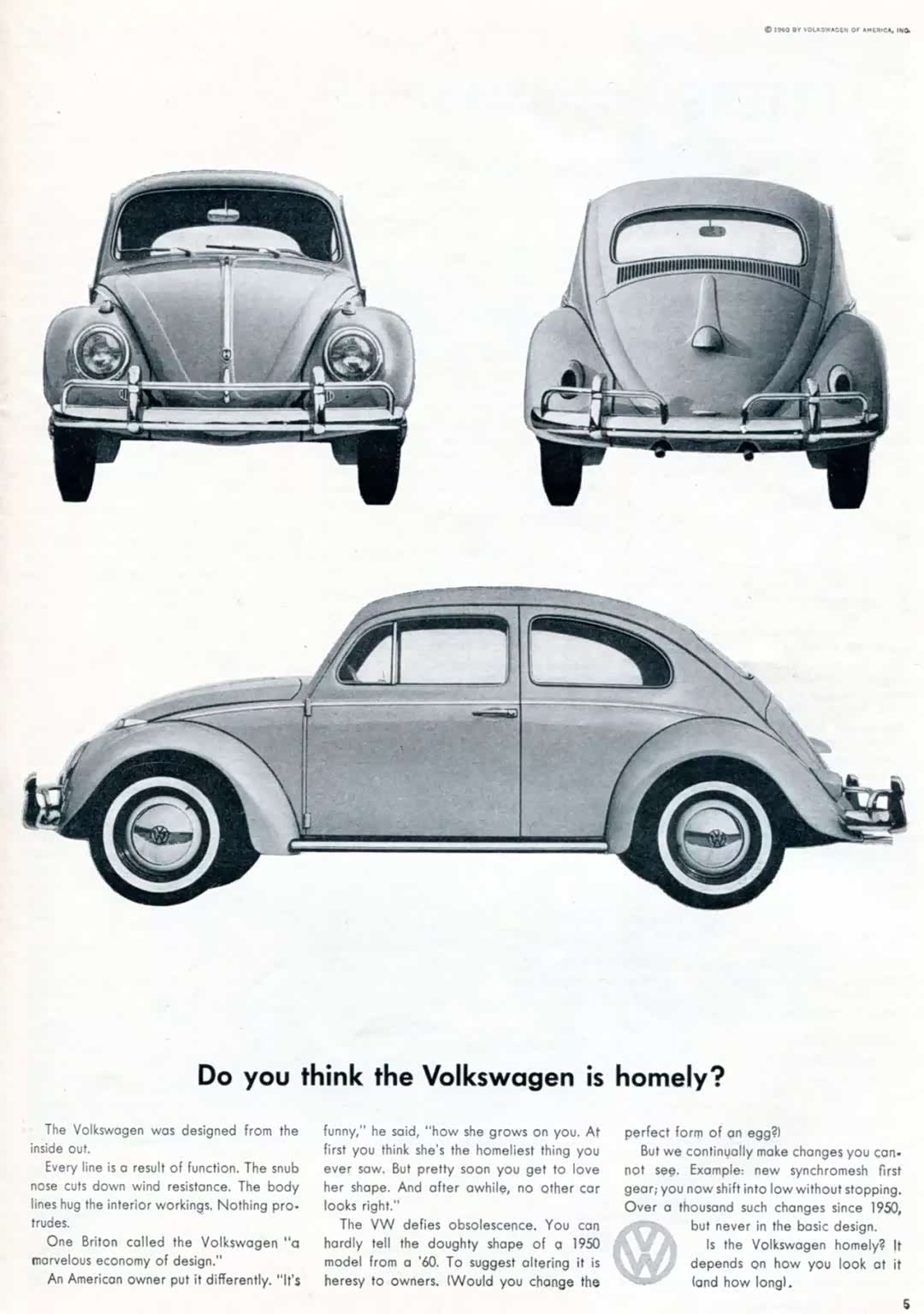拿下欧洲市场后,诺登霍夫与美国小型广告公司 Doyle Dane Berbach 合作,DDB 在参观了甲壳虫的工厂后,艺术总监 Helmut Krone 和文案撰稿人 Julian Koenig 决定用幽默、自嘲的方式把甲壳虫缺点转化为优势。当时美国的汽车广告普遍以“大、满、多”为主流,“往小了想”(Think Small)这句广告语新奇有趣,帮助甲壳虫成功打开了美国市场。